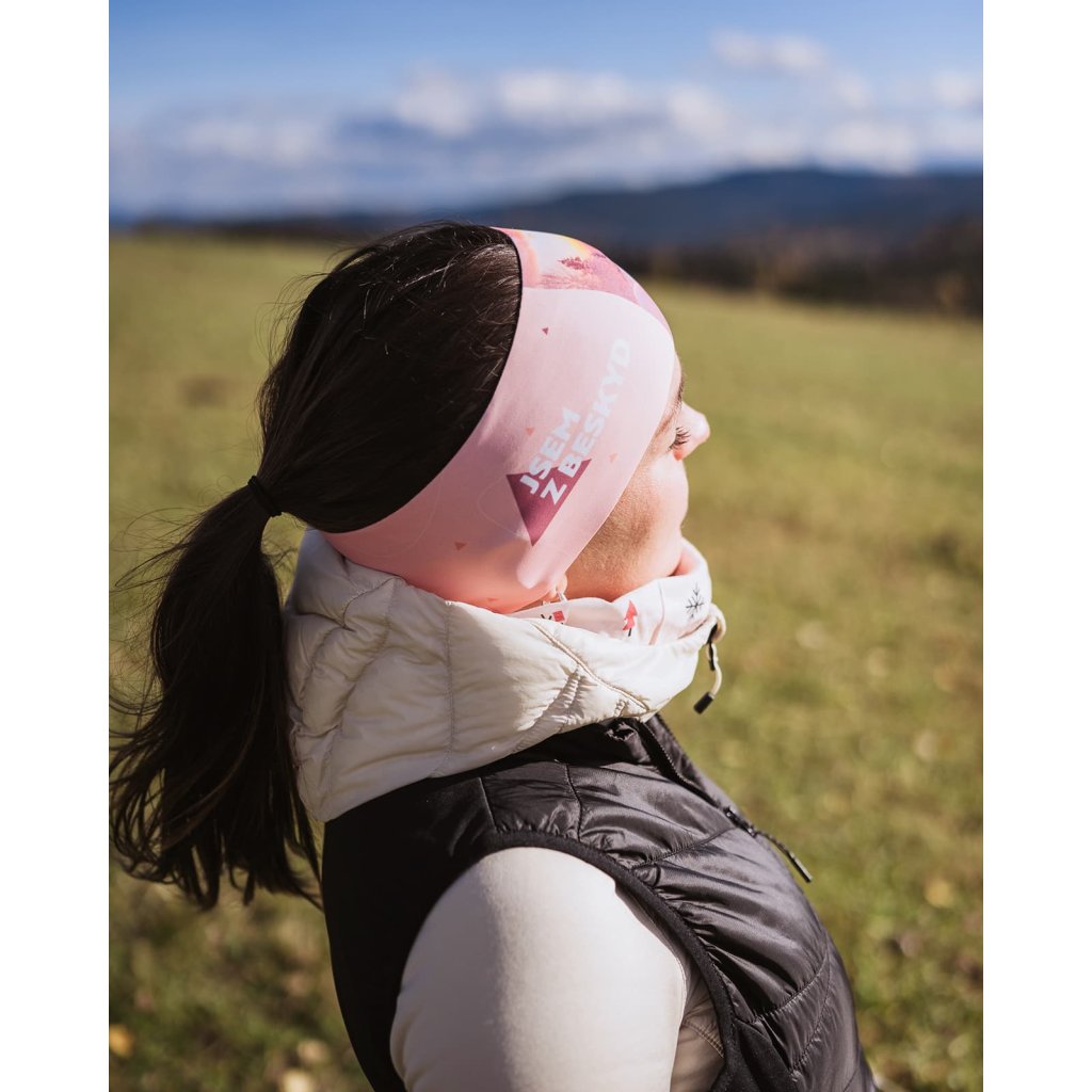 Nový design letní-přechodové růžové čelenky Jsem z Beskyd s motivem originální beskydské fotografie Petra Lukeše. Letní-přechodová čelenka je vyrobena v České republice ze špičkového funkčního materiálu Instinkt. Díky tomu si ji oblíbí jak vrcholoví sportovci, tak turisté a milovníci procházek.